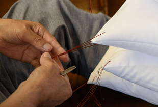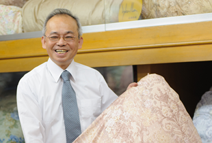 初代の頃より着物をほどき、ふとんの表地に使用して加工してきました。裏地を付けて、何十年もふとんを作り続けてきた加工職人が綿を入れ仕立てていきます。