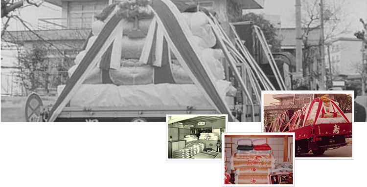 | 昭和25年4月 | 大阪船場大阪市東区唐物町3丁目30番地にて開業 丹前真綿・伴天綿・真綿布団・蚊帳(かや)の販売 |